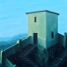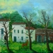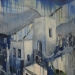 Vervallen gebouwen met bomen en hert. Acryl op papier.